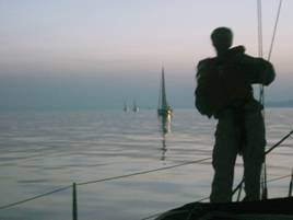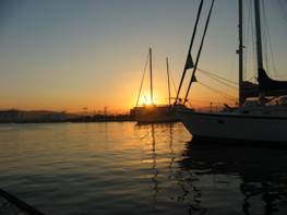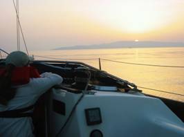 Na het verste punt van onze reis bereikt te hebben moeten we nu beginnen met de terugvaart. Het voorstel is om nachtzeilen te simuleren door vroeg in de morgen (nog donker) te vertrekken. Dit betekent dat de tocht en boot s’avonds al voorbereid dienen te worden en dat we bijtijds onze kooi op zoeken. Conform voorstel staan we om 03:00 uur op, drinken een sterke bak koffie om vervolgens de trossen los te gooien. De maan is ons goed gezind en verlicht onze weg richting Ermioni. Om 06:30 komen de eerste zonnestralen door en zijn we getuige van een schitterende zonsopgang. Na een ‘floating breakfast’ en zeemans douche (de wind laat ons in de steek) bereiken we tegen 15:00 uur s’middags Ermioni.