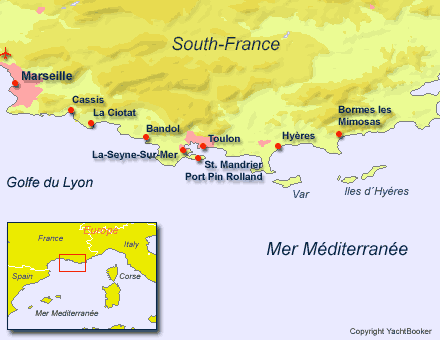 De gebieden in Frankrijk voor zeilboten, catamarans en zeiljacht huren in Frankrijk: De landstreek Var is een bekend vakantiegebied voor zeiljacht huren. Var strekt zich ruw genomen uit tussen Marseille en de Italiaanse grens en kenmerkt zich door de geur van de zilte zeelucht en kastanjebomen. Een kust met legio mogelijkheden en een Mistral die zorgt voor een meestal aangename wind. Veel gastvrije marina's langs de kust en bekend klinkende namen zoals Le Lavandou, Saint Raphael, Frejus en Port Grimaud. Voor vele zeilers het beloofde land en ook voor duikers is er het nodige te beleven.